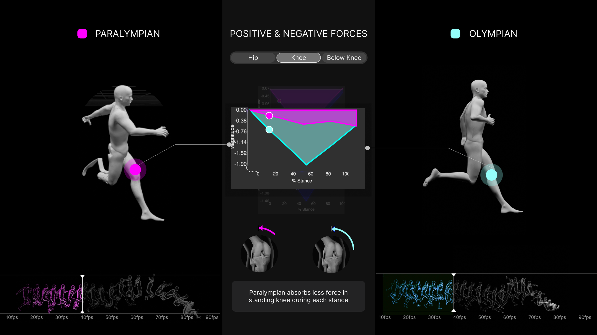 Explore Function: In what ways do biomechanics, such as the distribution of energy and force across different joints, differen tbetween Paralympians and Olympians, and how do these differences highlight the diversity of motion while pursuing the same goals?